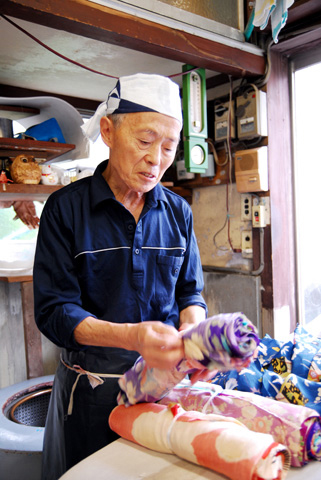 お客さんから受け取った着物をどう処理するか判断したあと、各分野のプロに仕事を依頼するが、その職人も、杉並区では少なくなっている。東京なら染色工場等が密集している神田川近くの高田馬場、早稲田、落合界隈などに出すことも多く、内容によっては京都に依頼することもあるという。