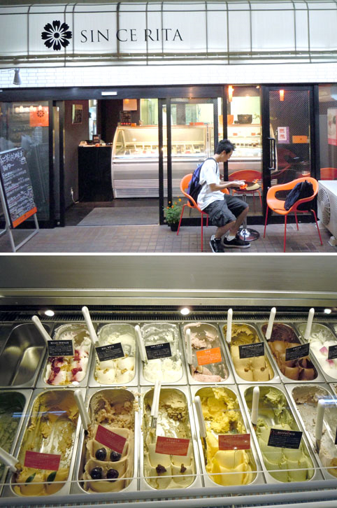 Wow, look at this! Such delicious looking gelato. I decided to try 3 of them; Mille-Feuille, Kokuto, and Pione. Eating the Mille-Feuille, I tasted strawberries and vanilla, but with some crunch from the cornflakes. Now what will Kokuto taste like? It tasted like caramel, since it's made from brown sugar. Last is Pione, the plum gelato. And that's what it tasted like, a fruity plum but I found out later that it's actually made from grape. I can't believe that tucked away in Suginami was Sin Ce Rita, producing such amazing gelato. Experience very smooth and creamy gelato overflowing with flavor.