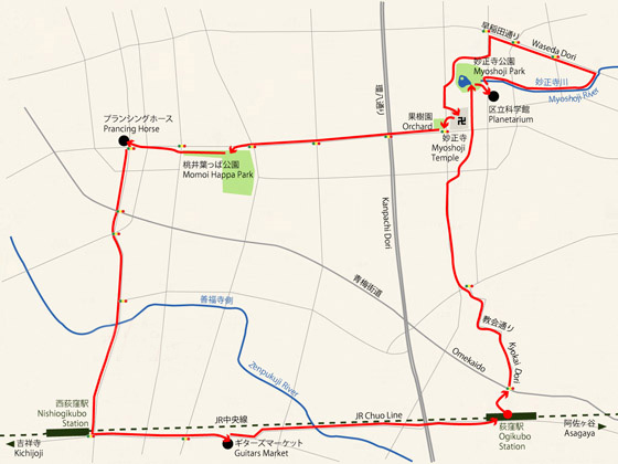 The most amazing thing to me about the route we took was that we both had planned to go to a lot of the same places independently of each other. Back in October I was looking for some places of interest and when I was in Nishi-Ogikubo. I found some interesting looking places including a Ferrari dealer. I thought it would be interesting for Japanese and foreigners alike. he had included a similar route and the Ferrari place! I never even mentioned it to anyone. So those destinations were a must, and also knowing our mutual love for guitars we added a vintage guitar shop to the tour, and along the way we walked along Myoshoji River and saw its namesake temple and park, as well as other places of interest along the path.