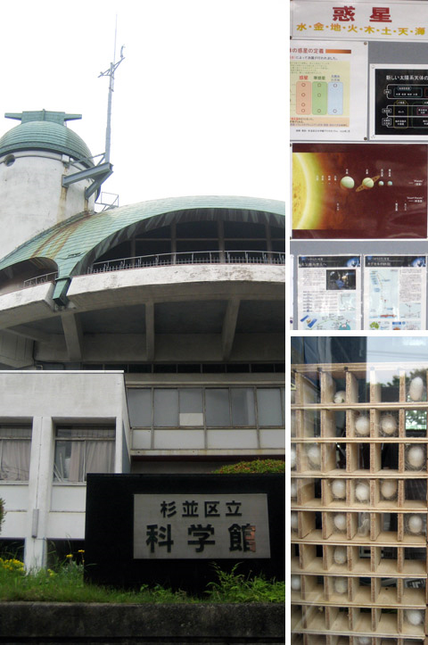 グレッグ:ダミアンから「妙正寺川の近くにプラネタリウムみたいなビルがある」と聞いて、行ってみようと思いました。ここはプラネタリウムと観測所のようです。残念ながら、日曜日は定休日で入れませんでした。開館時間にまた行ってみたいと思います。「杉並区立科学館」というところで、子供たちが科学のことについてたくさん学ぶ場所なのだそうです。窓越しから見える蚕棚に、興味を持ちました。