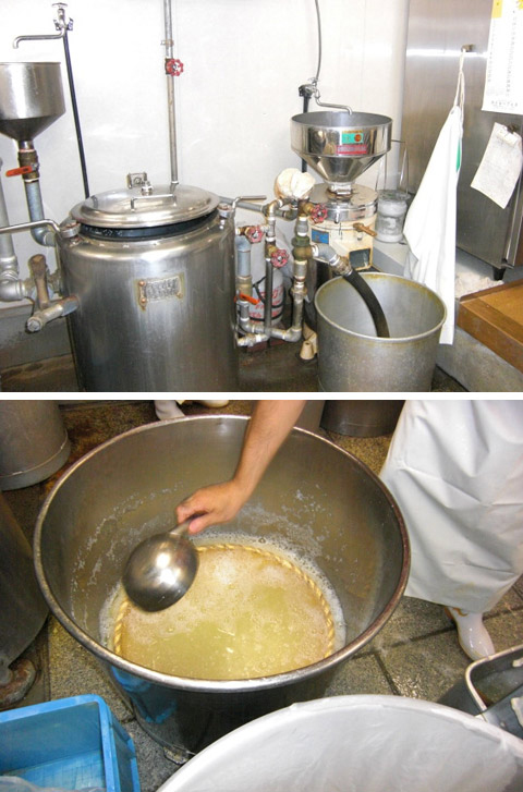 これらをすべて手作業で行う。油揚げは煮沸した大豆の上澄みの熱湯を手で掻き出して生地作りを行う。この作業は熱くて大変で、夏場が一番辛い。豆腐や油揚げの作る量は日によって違うが、注文の多いときは豆腐で120丁ぐらい作るので、この手作業を二度三度繰り返す。
