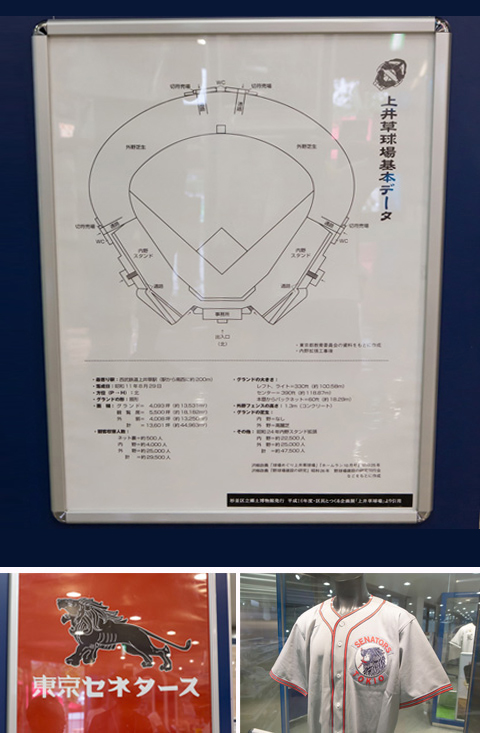 展示場入口付近には、上井草球場の全形図と面積、収容人員などの基本データー記載のパネルが展示され、当時としては設備が整った本格的な野球場であったことがわかる。