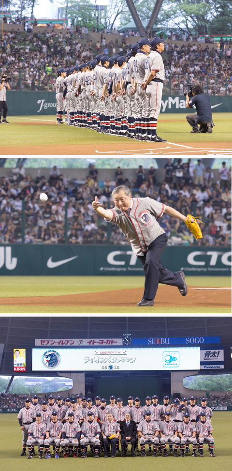 グラウンド上では、セネタースのユニホームを着用したライオンズの選手が整列。場内アナウンスやLビジョンの映像で、上井草に存在した東京セネタースの球団史などが紹介される。当時の球団歌「東京セネタースの歌」が場内に流れるころには、野球創成期の高揚感が伝わってくる。