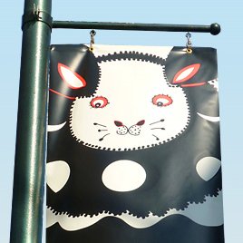 このフラッグは、商店街でブティック「アトリエ ラ・バレンヌ」を経営する山本豊さんがデザインしたもの。振興組合に頼まれたのがきっかけで、描きはじめてから7年になるという。「道を通る人々に好印象を与え、ありきたりでない大人の鑑賞にたえる作品を作ること」を心がけているという。半年に1回の新作発表時には、1ヶ月前から構想を練り、モティーフに合った表現方法を考える。山本さんの商店街振興への思いがこめられたフラッグは、商店街の顔となっている。