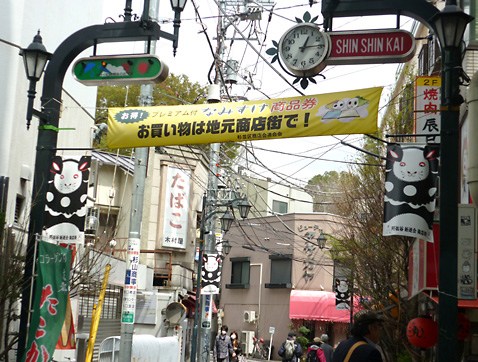 JR阿佐ケ谷駅北口、三菱東京UFJ銀行の横から始まる「阿佐谷新進会商店街」。道路に沿って飾られた商店街のフラッグは、かわいいともリアルとも異なる、個性的な絵柄で人目をひく。