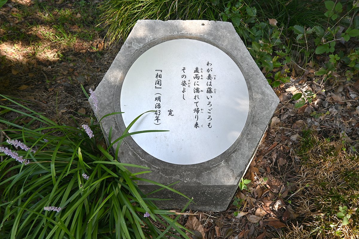最大の特徴は、庭園に調和した切り株風の歌碑14基。歌人の松平盟子さんらに選定された、人生・恋・家族にまつわる夫妻の名歌が1首ずつ刻まれている。門柱を挟むように位置する2枚の案内板「与謝野寛(鉄幹)晶子旧居跡」は、夫妻が荻窪に居を構えた経緯や晩年の生活模様を記載。実際の住居(「采花荘」「遙青書屋」「冬柏亭」)の平面図もあり、往時に思いを馳(は)せる楽しさが味わえる。また夫妻が好んで植樹したツツジや、晶子が多く歌に詠んだツバキなども点在。いわれある植栽と歌碑とがバランス良く配され、記念館を鑑賞しているかのごとく園内散策を堪能できる。