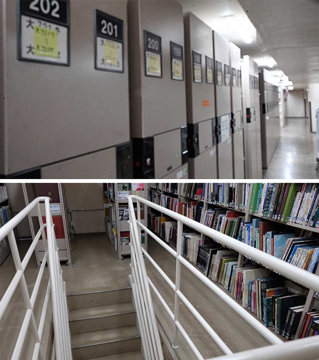 杉並区立の図書館全体では200万冊超(※4)の蔵書があり、中央図書館では約70万冊を保有、うち50万冊ほどが閉架で地下に保管されている。閉架は地下1階分が二層に分けられた構造になっており、書架がずらりと並んでいた。少しでも多くの本を入れるため、必要な時だけ隙間を作る電動書架もある。また、館外にある車庫のような建物は団体貸出用の本の書庫で、中央図書館本体の本とは別の扱いで運用しているという。