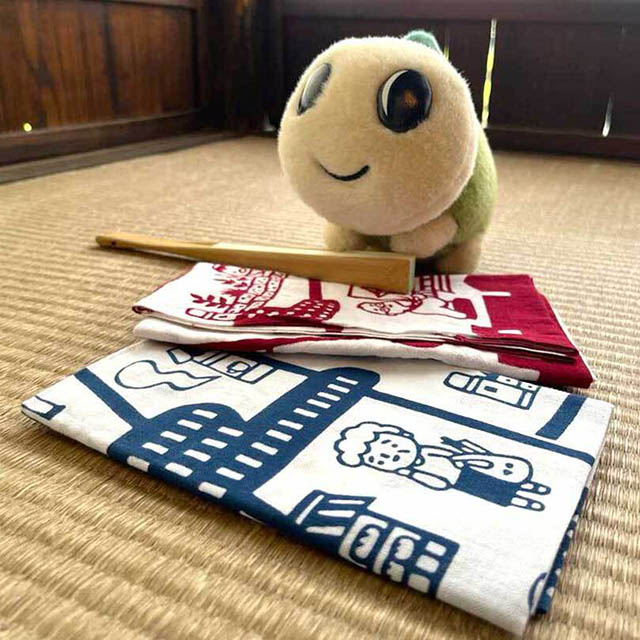 「高円寺演芸まつりオリジナル手ぬぐい」は、高円寺の風景がかわいい切り絵風に描かれているよ~💛