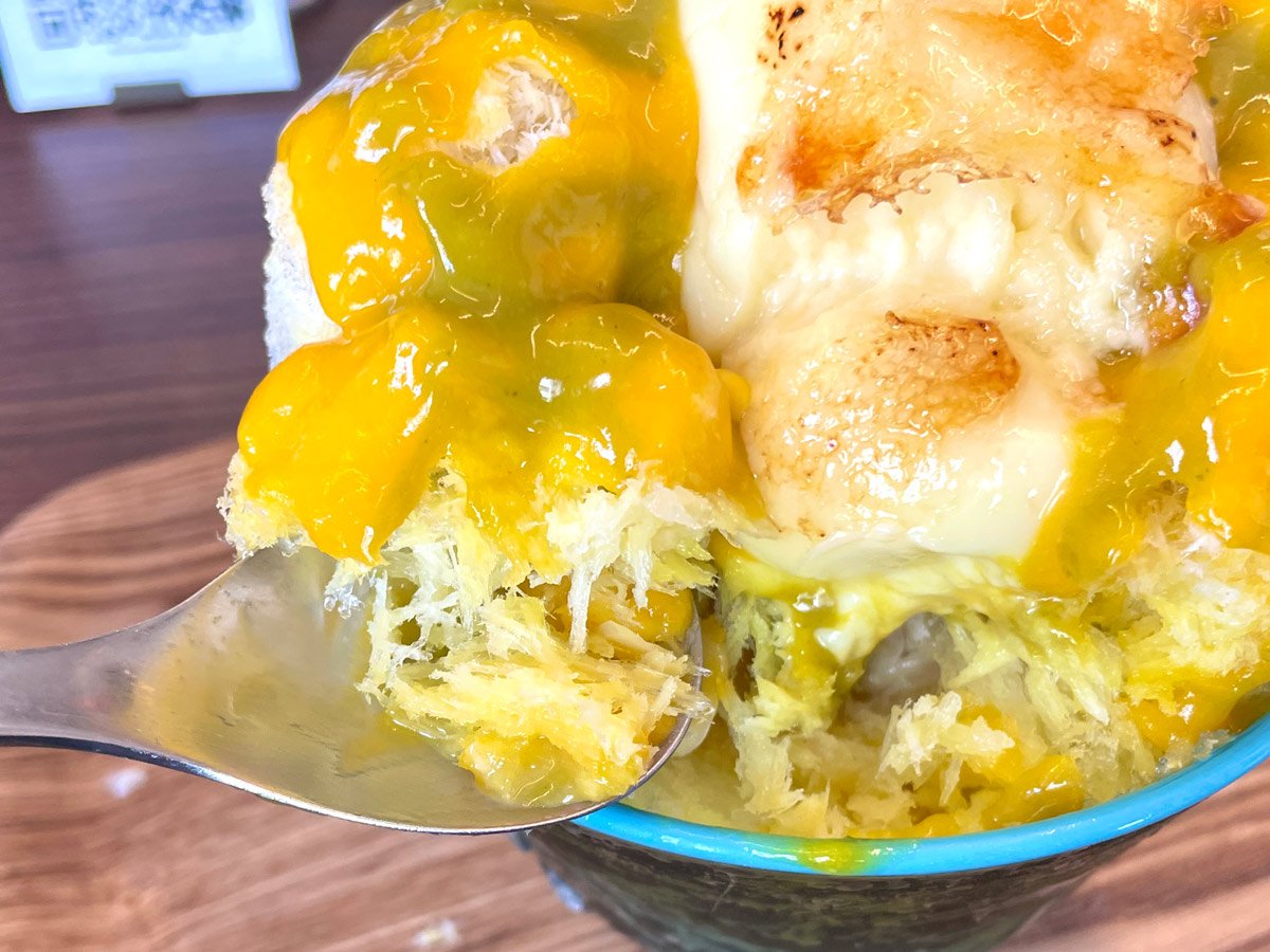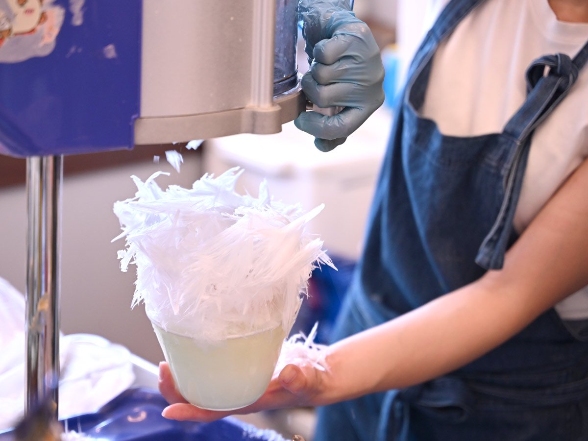 かき氷で何といっても大切なのは氷の状態だと松本さんは話す。硬過ぎず、柔らか過ぎず、氷のゆるみ(溶け)具合を見極め、最良の状態で削り始める。「タイミングを見逃すとゆるんでシャバシャバとしてしまいます、口当たりを考えると本当にこの削り始めが大事なんです」という。削られた直後はまるで針葉樹のような勢いのある氷が、あっという間に慣れた手つきできれいに丸められ、食材がこれでもかとトッピングされて完成する。
