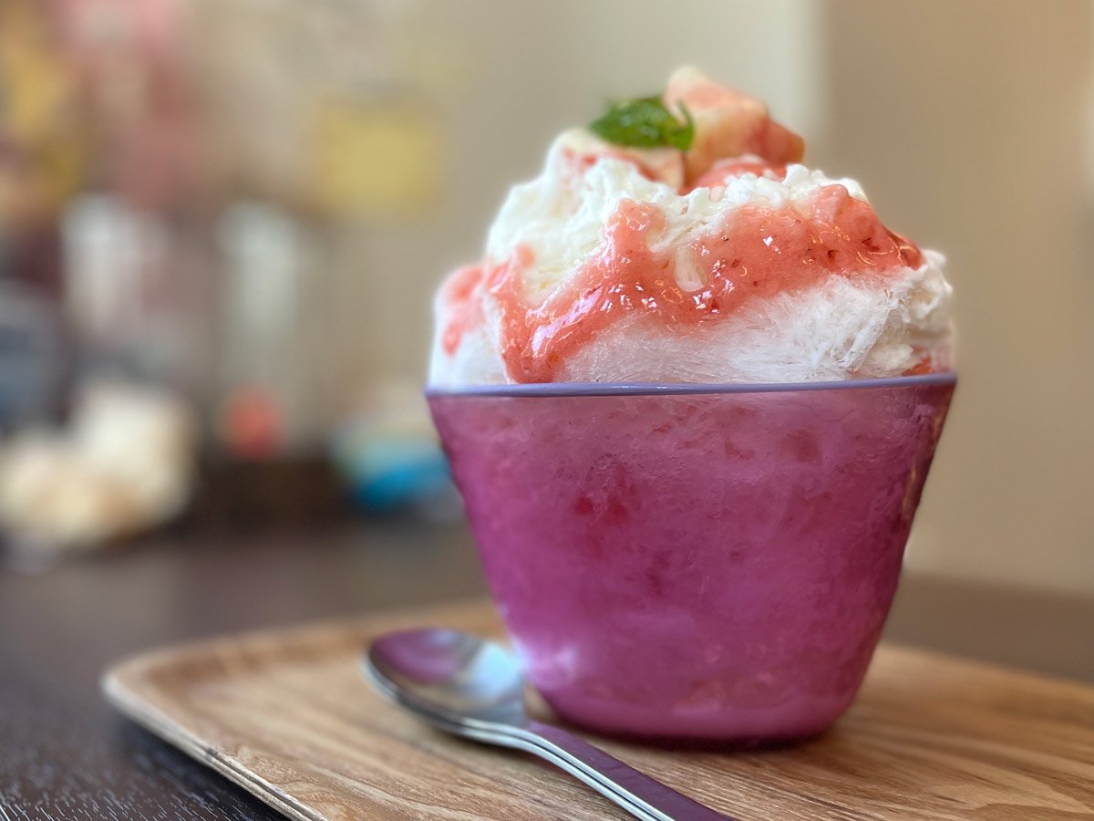 阿佐谷には以前より友人が住んでいたり、先輩が飲み屋さんを経営したりとなじみのある街で、ここで物件を見つけた時はすぐに開業を決めた。店内はカウンター数席のみでバーのようなスタイルだが、明るいインテリアで軽やかな雰囲気だ。そしてカウンターの中にどんと鎮座するアイスシェーバーが印象的。盛夏にはドアの外に数人が並ぶこともある。
