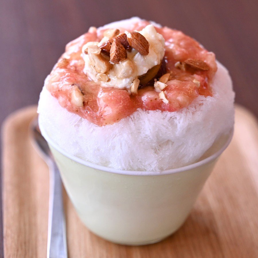 トッピングを考える時は、イタリアン料理なども参考にするという。日本人になじみのない食材の組み合わせにヒントを得て、氷との相性を試行し新しいメニューを完成させている。