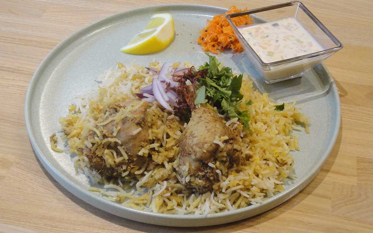 メニューは「チキンビリヤニ」と「骨つきマトンビリヤニ」。チキンはヨーグルトとスパイスでマリネされており、しっとりとジューシーな味わい。マトンはすね肉をしっかり煮込んであり、関節や筋まで柔らかく、骨まわりの肉をこそいで食べるのもおいしい。2種盛りの「チキン&マトン」も用意されているので、同時に両方とも楽しめる。