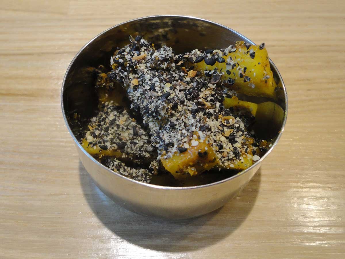 「パニプリ」はインドの軽食。小麦粉を丸く薄く揚げたプリに、具材とパニ(スープ)を入れたスナック感覚の料理だ。セビーチェ風(エビとタコのマリネ)、カプレーゼ風(トマトとバジルとモッツァレラチーズ)、ひき肉とサワークリーム、アップルコンポートとクロテッドクリームの4種類で、インド風にこだわらない具材が特徴である。またインドのピクルスであるアチャールも和風にアレンジ。「ムラコアチャール(大根の山椒漬け)」はピリリと辛く、ビリヤニとの相性も抜群。