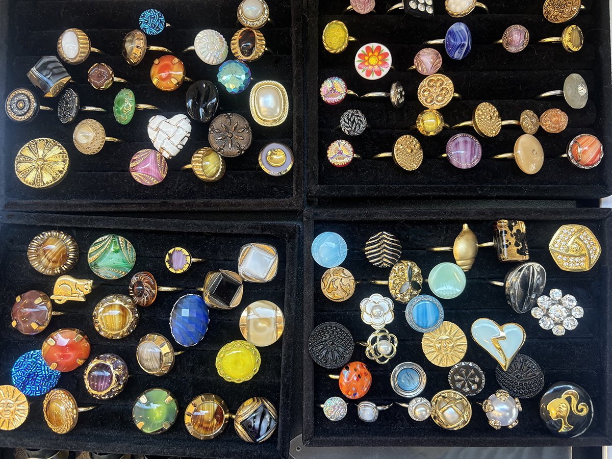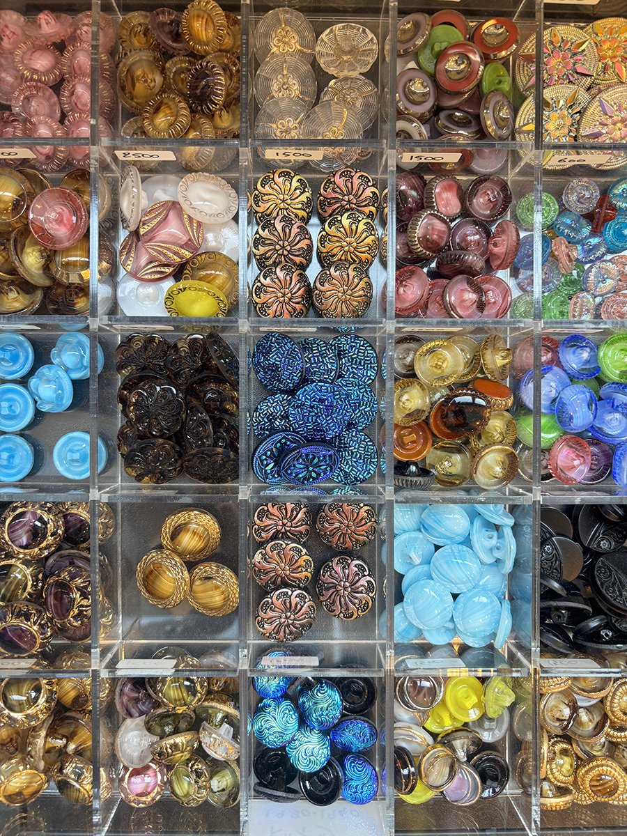 アクセサリーに使うヴィンテージボタンやビーズは、1930年代から1980年代に欧州で作られたものだ。気に入った素材を見つけると、ひとまず手に入れ、アイデアが浮かぶまで寝かせておくこともあるという。「複雑なデザインより、素材を生かしたシンプルなデザインが好き。色の組み合わせやパターンを変えて表現することで、魅力的になります」