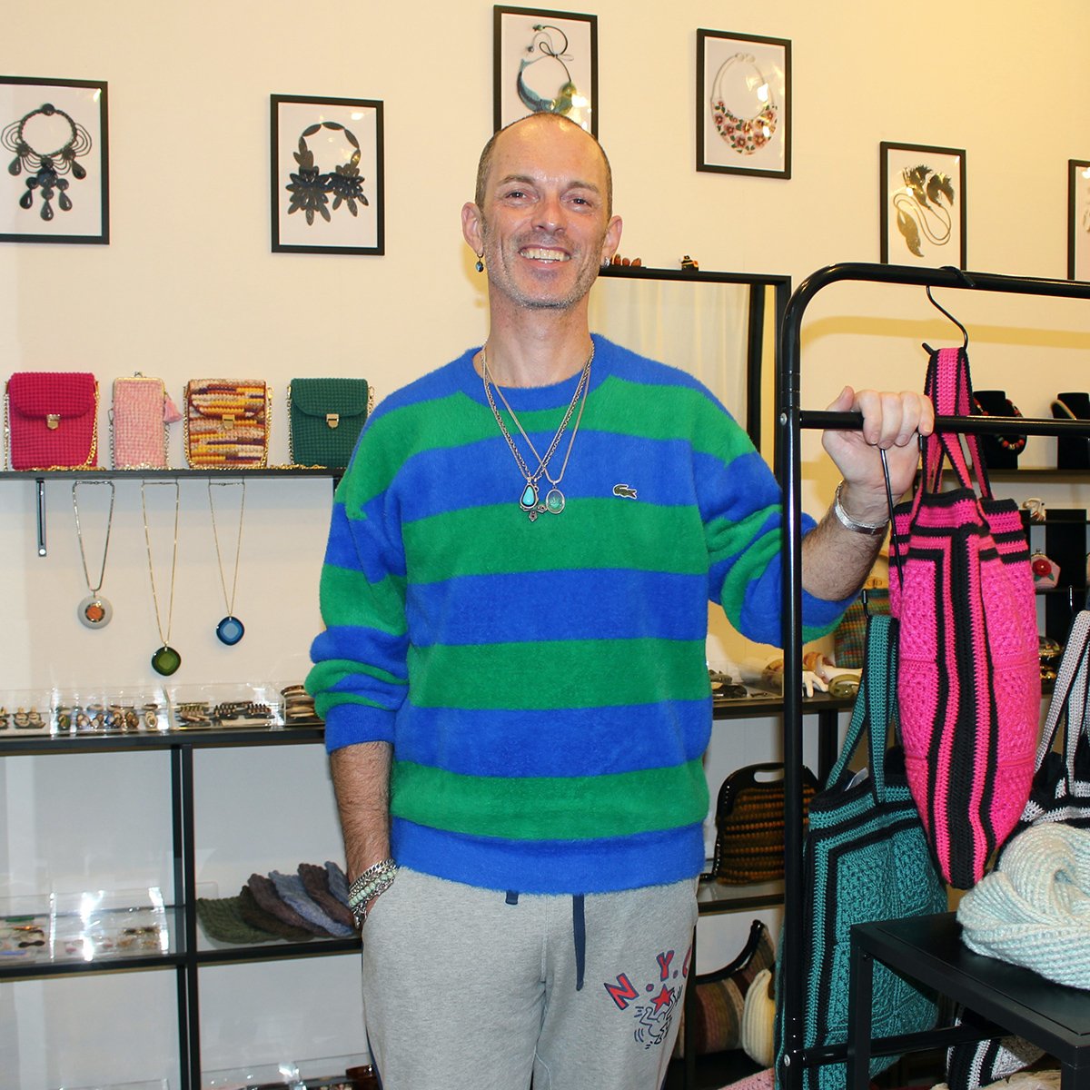 自然光が差し込む明るい店内には、色鮮やかな商品が並び、その奥にアーメルさんが手を動かす姿が見られる。そこはまさにアーメルさんの「アトリエ」だ。ハンドメイド作家となった背景や、作品へのこだわりと思いについて、アーメルさんに伺った。