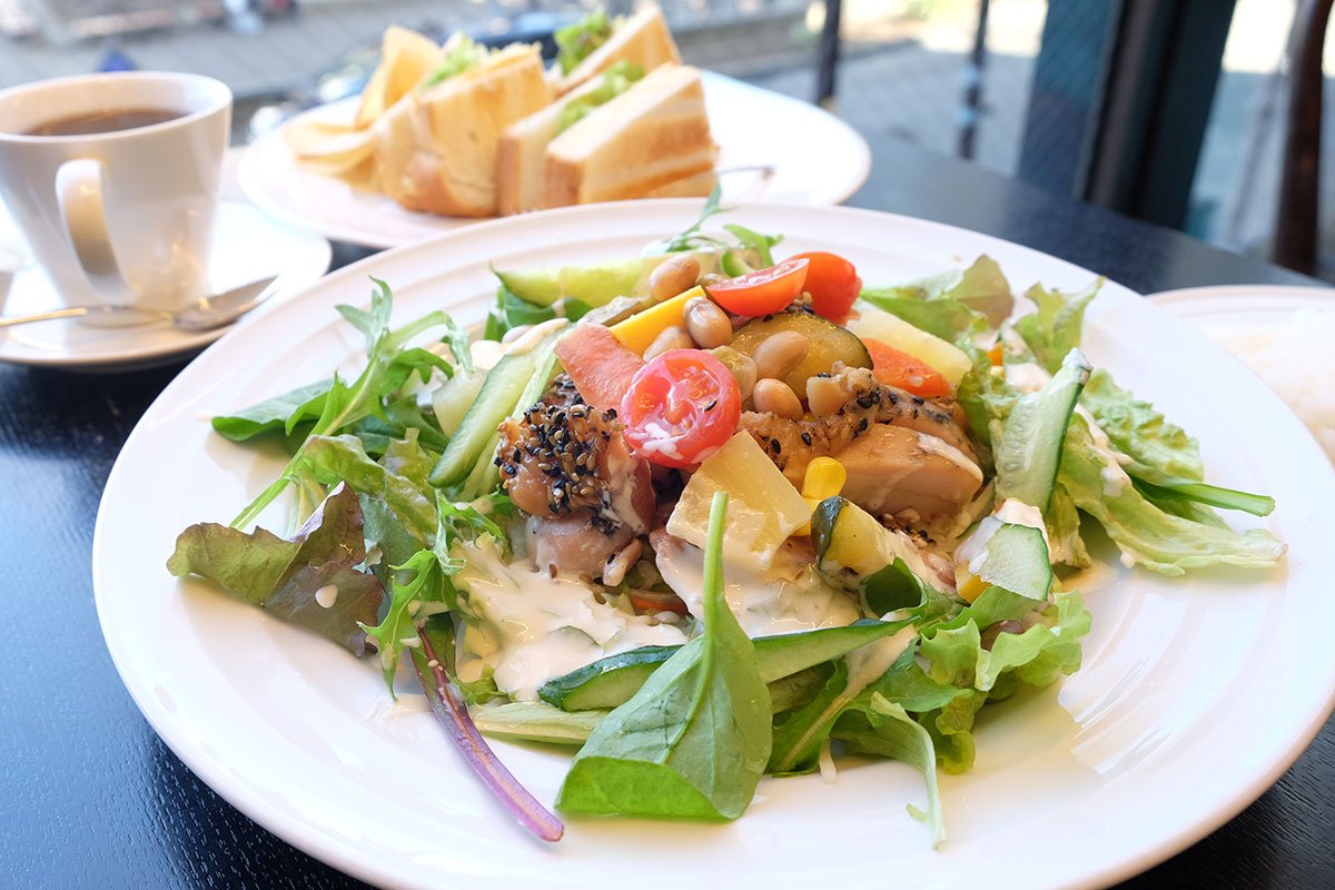 メニューには大豆を30%使用したハンバークや、野菜たっぷりのプレートなどヘルシーなものが多い。「若鶏(みちのく鶏)の胡麻風味焼き・サラダ仕立て」には意外な食材も日替わりで使われており、取材時には厚焼き玉子と大豆、うぐいす豆、パイナップルが入っていた。玉子とハムのサンドイッチもあるが、迷った時には「ミックス焼きサンドイッチ」がおすすめ。玉子とハムの他、チェダーチーズが挟まれている。