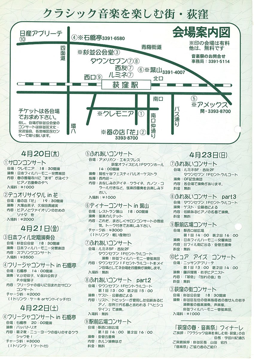 2000(平成12)年4月20日から23日までの4日間にわたり、第1回の音楽祭が開催された。南北の分断を融和するかのように、荻窪駅を挟んで南に3会場、北に8会場で延べ15回のコンサートが開かれ、春の荻窪をクラシック音楽が彩った。どの会場も満席のにぎわいだった。