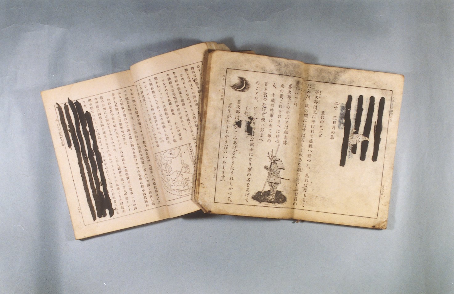 1945(昭和20)年の11月に戻ってから、すぐ学校が再開されました。昨日まで軍国主義だったのが急に民主主義になって、戸惑いました。教科書もすぐには変えられないですから、軍国主義的なところを墨で塗りつぶして、そこを飛ばして。しばらくしてから、製本されていないペラペラの状態の教科書が届いたので、それを自分たちで折って、使っていました。
